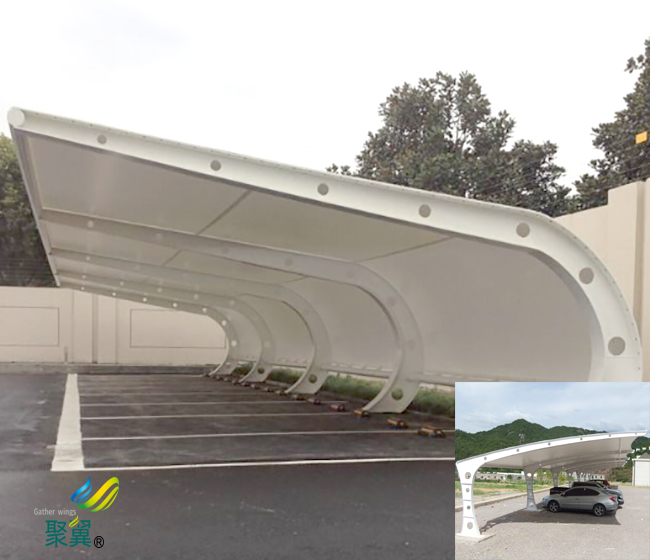 膜結構車棚景觀造型不同,可呈現(xiàn)多變、新穎、吸引人的視覺結果。膜結構車棚的應用范圍限于體育或展覽建筑,還擴展到住宅和景觀建筑。
