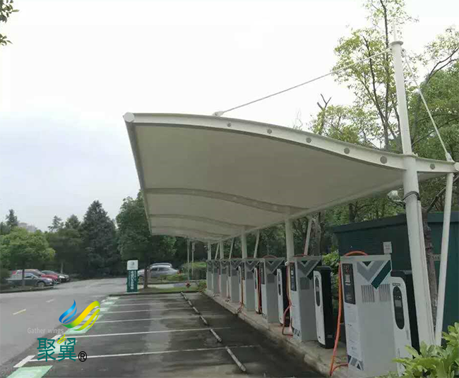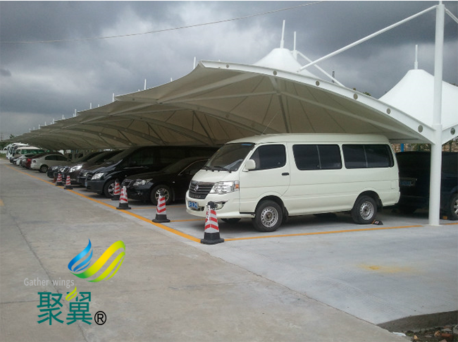 膜結構車棚主要是用PVC材料的主要特點是強度低、彈性大、易老化、徐變大、自潔性差,但價格便宜,容易加工制作,色彩豐富,抗折疊性能好。為改善其性能,可在膜結構車棚表面涂一層聚四氟乙烯涂層,提高其抗老化和自潔能力,其壽命可達到15年左右。