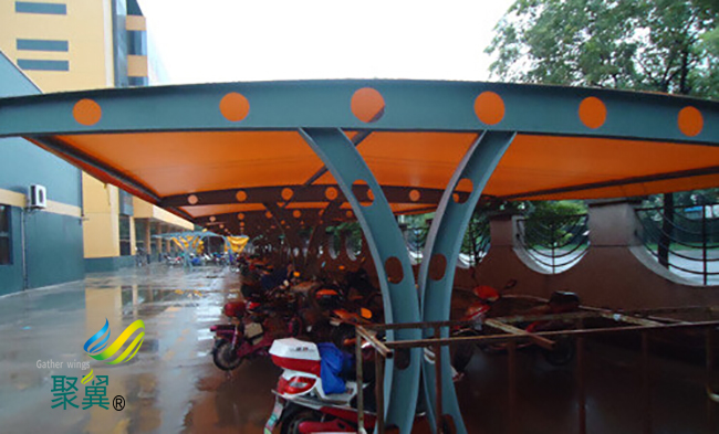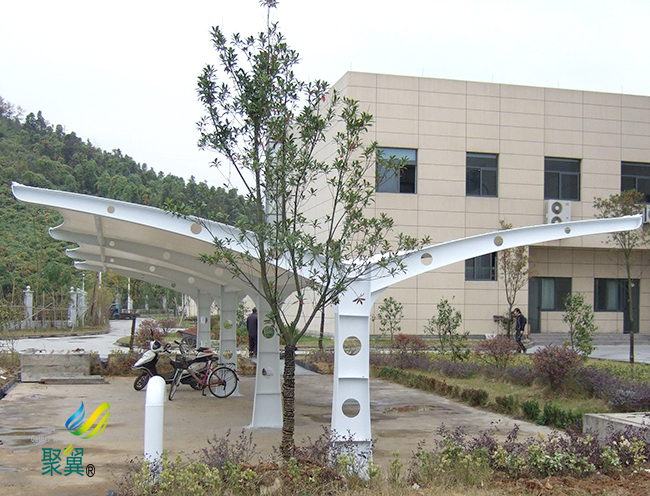 膜結構車棚造型簡潔大方,外觀雅致飄逸,結構輕盈,經久自潔、節能減耗,經濟適用,維修簡單。