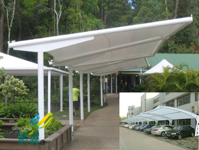 膜結構車棚可以利用雨水的自然沖刷來清潔建筑物的外觀,也可以增加建筑物的使用壽命,膜結構車棚還具有運輸方便、比較新并且方便、不易積雪等優點。