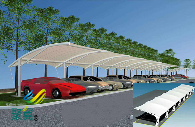 膜結構車棚儉約能源:建筑膜資料自身透光性較好,透光率在7%~20%支配,日間使用不需野生照明,完全能滿足各類體育競賽等勾當必要;膜結構車棚膜資料對光的折射率在70%以上,在日光映射下,棚內造成柔和的散光,給人以安定、黑甜鄉般的感觸。
