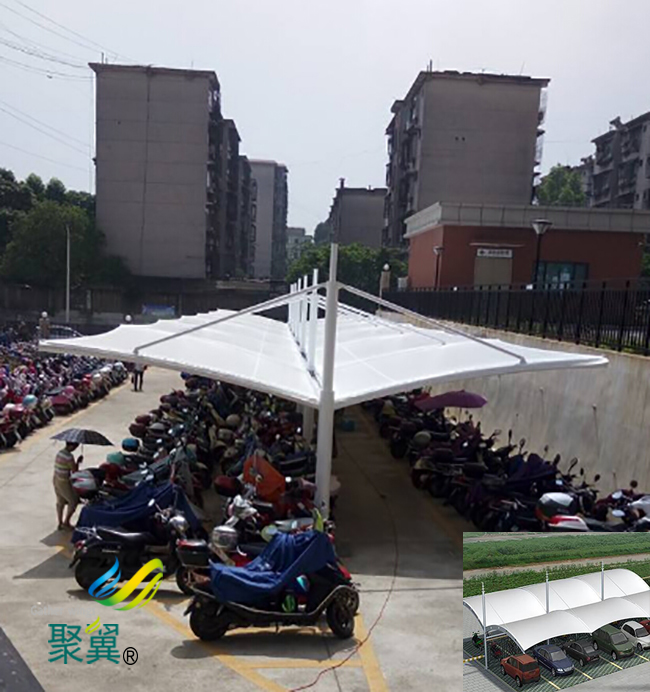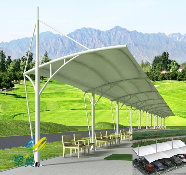 膜結(jié)構(gòu)車棚獨(dú)特,重量輕,富有時(shí)代氣息。另外,膜結(jié)構(gòu)車棚便于拆卸、組裝和移動(dòng),施工方便,對(duì)臨建的成型**方便。