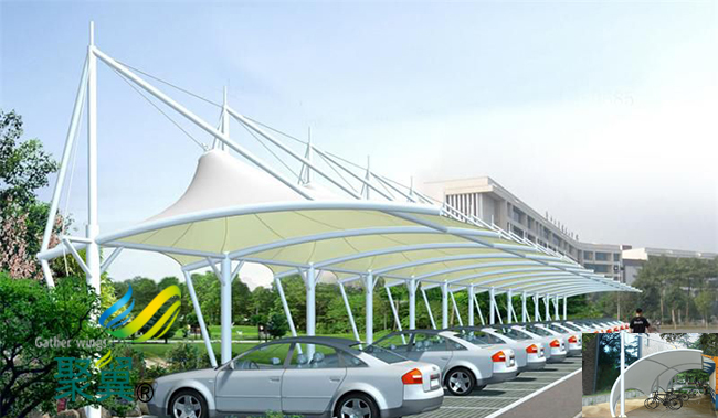 膜結構車棚具有藝術性,充分發揮建筑師的想象力,又體現結構構件清晰受力之美。由于膜材具有一定的透光率,白天可減少照明強度和時間,能很好的節約能源。同時夜間彩燈投射形成的絢爛景觀也能達到很好的廣告宣傳效益。