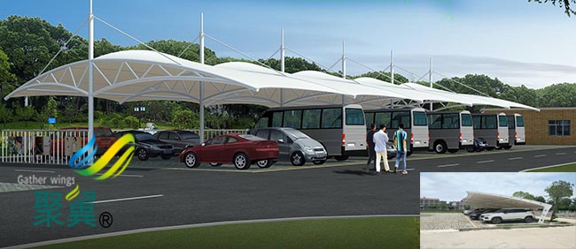 膜結構車棚由于膜材料本身具有良好的透光率(10%-20%)建筑空間白天可以得到自然的漫散射日光,可以節約大量用于照明的能源。
