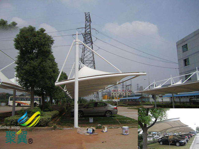 膜結構車棚如遇上勁風氣候,柱、主梁、支撐等大構件應立即進行校對,方位校對精確后立即進行固定,以避免發生單側失穩。當天裝置的構件,應構成空間穩固體系。