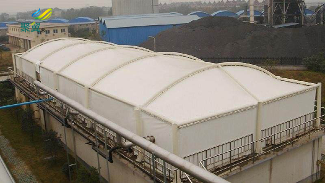 膜結構污水池加蓋使用抗酸、堿腐蝕的環境膜材作為密封材料,可有效延長密封罩的使用年限。除此之外,膜材還有質輕,易安裝的屬性。