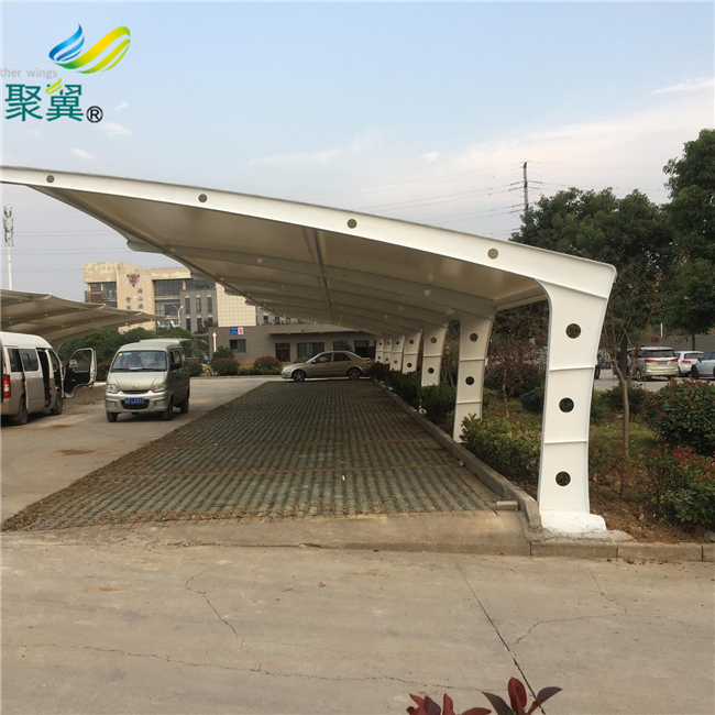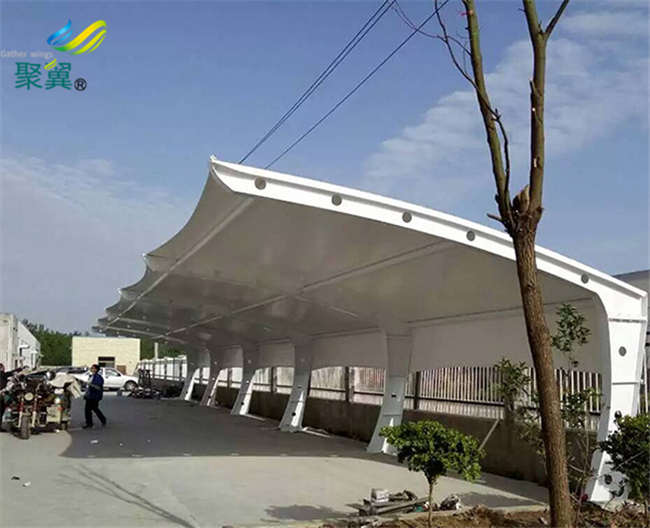 膜結構車棚是近年來膜結構材料應用的一個新領域。膜結構建筑可以很好的覆蓋所有車棚。膜結構的張力模式使建筑的空間跨度更大,同時可以減少建筑的結構,減輕建筑的整體重量,從而使應用簡單方便,這些是膜結構被用戶選擇的關鍵因素。膜材料表面有一種涂層,用于防止灰塵和雨水的影響,保護膜結構的使用壽命為作用。車棚制作安裝分項工程應根據具體情況劃分為一個或幾個檢驗批,并按規定進行工序質量驗收。