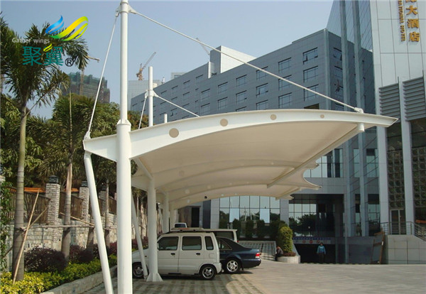 膜結構工程停車棚的棚布材料是膜結構工程,而膜材的較大 特性是抗壓強度高、使用性能好、防火安全阻燃、自洗性好,不會受到紫外光危害,使用期長,一般15-30年。膜結構工程停車棚具備高透光度,透光度為13%,對能源透射率73%,熱吸發熱量非常少。膜結構工程中的高韌性柔韌性塑料薄膜稱膜材,它是一種耐久度用、高韌性的鍍層紡織物,由紡織物和鍍層復合型而成,具備材質柔韌性、薄厚小、重量較輕、透光度好的特性。對太陽光消化吸收和散射工作能力、阻燃性,具備優良的耐久度、防火安全、氣密性等特點;表層歷經氟素處理或二氧化鈦解決的膜原材料耐老化特性好,具備較高的自清理特性。膜結構工程建筑美學幽美,膜結構建筑是二十一世紀膜結構具象征性與填滿發展前途的建筑形式。