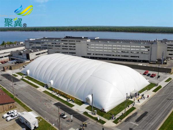 最常見的氣承式膜結構的外形是半球體或者半圓柱體兩邊是四分之一球體。其實只要建筑主體依同一軸線設計氣承式膜結構建筑可以適用于任何形狀。