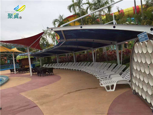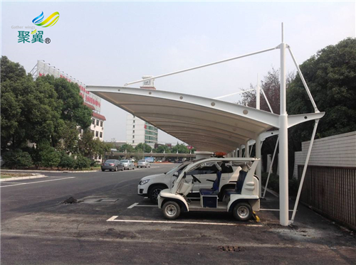 膜結構車棚膜結構建筑中*常用的膜材介紹。膜材料是PTFE膜材料和PVC膜材 料。PTFE膜材料是指在用極細的玻璃纖維編織成的基布上涂抹PTFE(聚四氟乙烯)樹脂而形成的復合材料,其特點是:強度高、耐久性好、防火阻燃、自潔性好,而且不受紫外光的影響,使用壽命在20年以上;具有高透光性,透光率為13%,而且透過膜材料的光線是自然散漫光,不會產生陰影,也不會發生眩光。