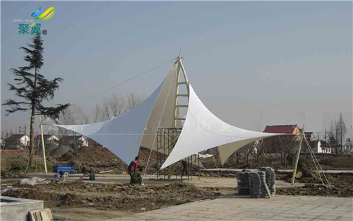 這種結構形式所采用的材料是高強度織物材料,經緯交織,雙面PVDF涂層,耐久性10年以上;且重量輕,相當于普通鋼結構屋面的1/10;所以能滿足大跨度的要求。