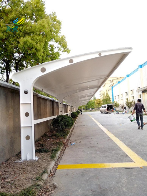 膜結構車棚在室內人們對白色或米白色膜材會有很好的顏色感知,由于這兩種顏色表現出對可見光具備線性光譜透射的特征。透射程度隨透射光波長的增加而增加,這使得透射光比入射光略溫暖。透射光譜與纖維及其特性、涂層的厚度以及附加面層有差,生產商應給出更多的詳細信息。相對于涂覆PVc的聚酯纖維膜材,涂覆PTFE的玻璃纖維膜材的透射光譜。