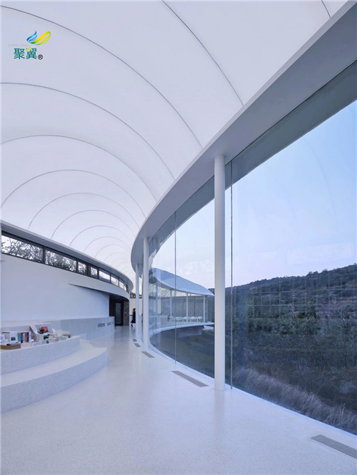 它的獨特曲面外形使其具有強烈的雕塑感。膜面通過張力達到自平衡。張拉膜結構可使建筑師設計出各種張力自平衡、復雜且生動的空間形式。在一天內隨著光線的變化,雕塑般的膜結構通過光與影而呈現(xiàn)出不同的形態(tài)。日出和日落時,低入射角度的光線將突現(xiàn)屋頂?shù)那屎透〉裥Ч栁挥谶h地點時,膜結構的流線型邊界在地面上投入彎彎曲曲的影子。利用膜材的透光性和反射性,經(jīng)過設計的人工燈光也可使膜結構成為光的雕塑。