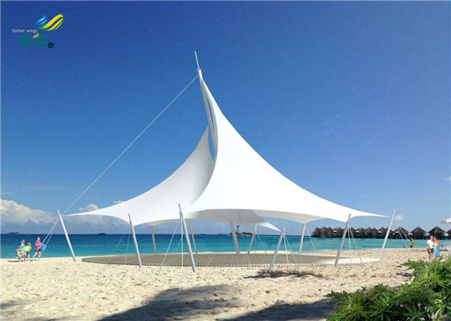 景觀膜結構建筑的支撐一般為鋼結構,國內對于鋼結構的保護多采用涂防火涂料。國外類似建筑大多是不涂防火涂料的。還有一種更為穩妥的辦法:***是在構造上作處理,使膜面緊貼在鋼索下面,火災中煙氣首先面對的是膜面,這樣鋼索下面又多了一個保護層,使鋼架不受任何高溫作用。