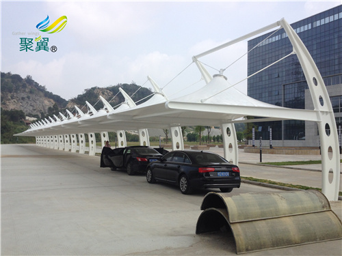 膜結構車棚抵御風雨的能力是一般雨蓬所不可比擬的。一般膜材使用壽命可達15年以上。有的車棚采用永久性膜材,可以使用三、四十年。特別是遇到劇烈的暴風雨天氣,膜結構建筑巋然不動,毫發不損。