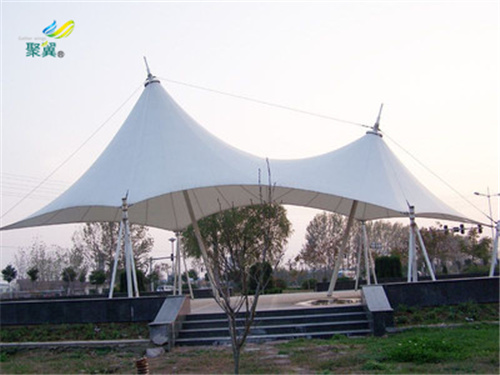張拉膜結構可使建筑師設計出各種張力自平衡、復雜且生動的空間形式。在一天內隨著光線的變化,雕塑般的膜結構通過光與影而呈現出不同的形態。日出和日落時,低入射角度的光線將突現屋頂的曲率和浮雕效果,太陽位于遠地點時,膜結構的流線型邊界在地面上投入彎彎曲曲的影子。利用膜材的透光性和反射性,經過設計的人工燈光也可使膜結構成為光的雕塑。按照現有的各國規范和指南設計的輕型張拉膜結構具有足夠的安全性。輕型結構在地震等水平荷載作用下能保持很好的穩定性。