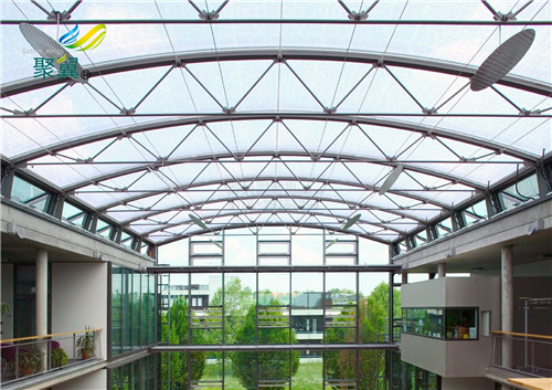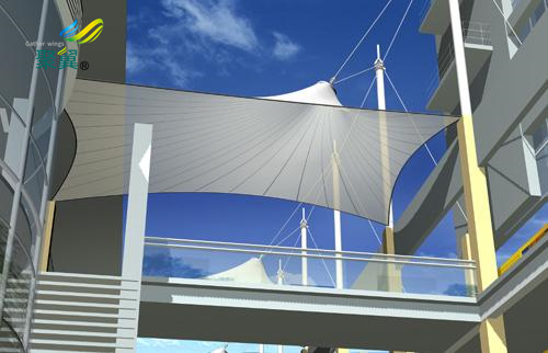 半透明是膜結構最顯著的特征,與其它材料相比,無論是在美觀上或是在操作上,都有顯著的優越性;散射光線,消除眩光,能將光線廣泛地漫射到其內部空間;材料內部涂層具有較高的反射率,能在夜間保持室內的照明效果;夜間逆光照射下表面發光;自然照明,節省能源。