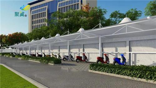 膜結構自行車車棚是由多種高強薄膜材料及加強構件(鋼架、鋼柱或鋼索)通過一定方式使其內部產生一定的預張應力以形成某種空間形狀,作為覆蓋結構,并能承受一定的外荷載作用的一種空間結構形式。