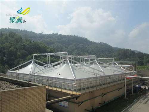 隨著用地情況越來越緊張,部分污水廠難免會將場址設在居民樓附近,而暴露在外的污水池內的臭氣會隨風飄散到居民樓內。為了解決此類問題,對數污水廠會選擇給池體加裝個污水池加蓋膜結構。可根據客戶的池體外形將膜結構污水池蓋板制作成圓形、拱形或方形,也可根據蓋子的立體型態制作成立體型或簡單的面型。