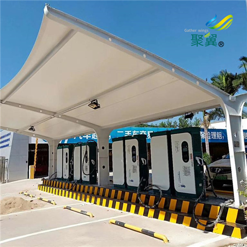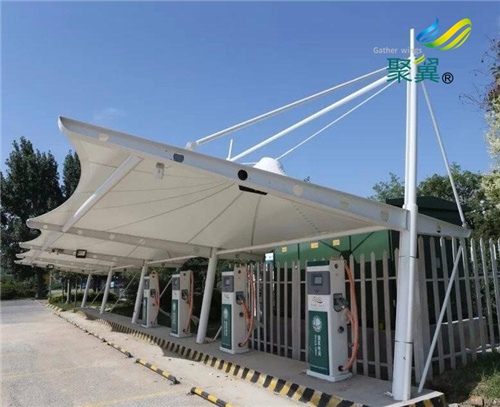 膜結構停車棚+充電樁裝置結合一起的一種車棚形式,讓電動車主給車充電提供了一個便利選擇。