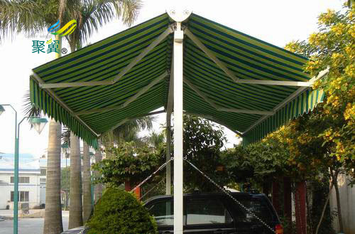 遮陽棚子采用高強度鋁合金制成的曲臂以及骨架,牢固抗風,收縮自如,使用壽命長達15年 昕景遮陽棚使用的遮陽布是由當今歐洲流行的聚丙烯晴綸制成,此材料耐光照、耐拉伸、耐腐蝕、耐寒冷、耐高溫、能抵抗任何環境氣候的影響,且防水、易干、質量特別穩。