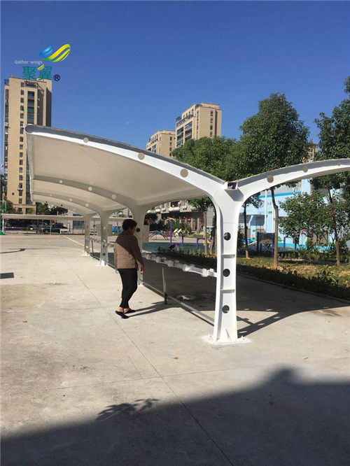 三、裝設膜結構充電樁車棚之前,應當對支承結構與膜結構的連接位置進行復測并作記錄。如果復測值與設計值的偏差將影響到膜結構的安裝或改變膜結構受力狀態,應由設計方、支承結構和膜結構施工方及有關方面共同協商解決辦法。