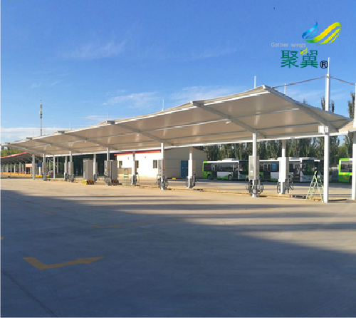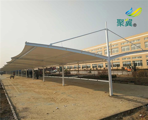 2、膜結構車棚雙面覆蓋膜片錯排成較厚接點,錯排接點可以降低荷載傳遞的不連續性。