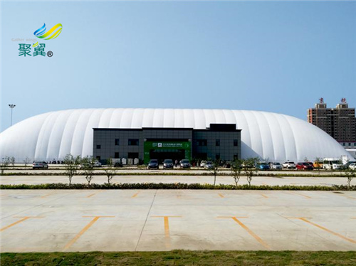 充氣膜結構將膜材料固定在屋頂結構周圍,利用送風系統將室內空氣壓力提高到一定壓力,使屋頂內外壓差,抵抗外力,由于采用氣壓支承,以鋼索為輔助材料,不需要任何梁、柱支承,可有較大的空間,施工速度快,經濟效益好。越來越高,但需要保持風機24小時運行,在連續運行和機器維護成本都較高。