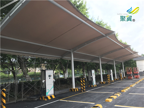 3.埋入零件的膜結(jié)構(gòu)車棚安裝與處理。定位埋入零件的安裝位置,鉆孔安裝。要求嵌入式零件準(zhǔn)確、牢固地定位。高程偏差不大于9mm,左右位移不大于20mm。