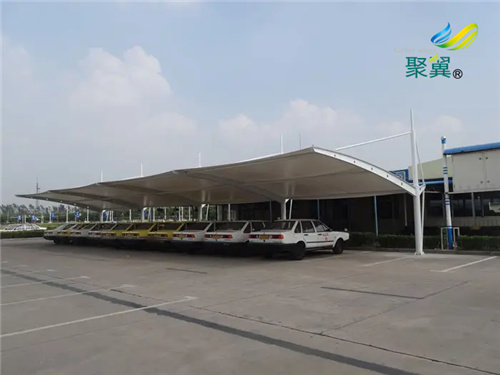 PTFE膜是在超細玻璃纖維織物上,涂以聚四氟乙烯樹脂而成的材料。PTFE膜最大的特點就是耐久性、防火性與防污性高。但PTFE膜與PVC膜比較,材料費與加工費高,且柔軟性低,在施工上為避免玻璃纖維被折斷,須有專用治工具與施工技術(shù)。其特點如下: