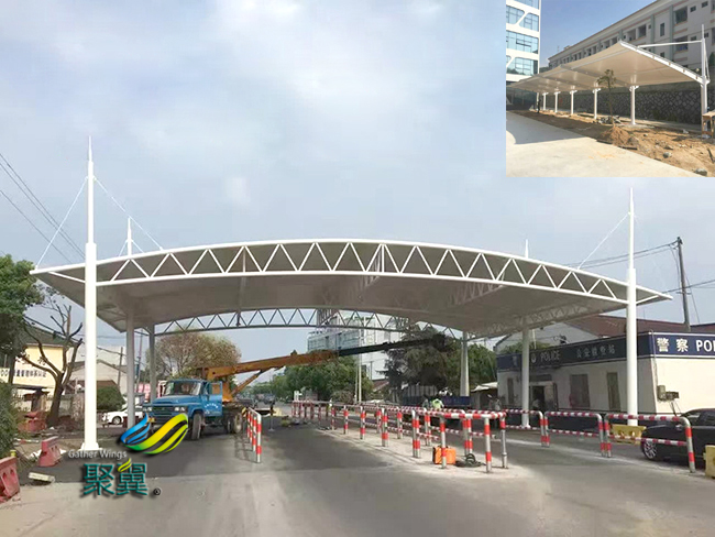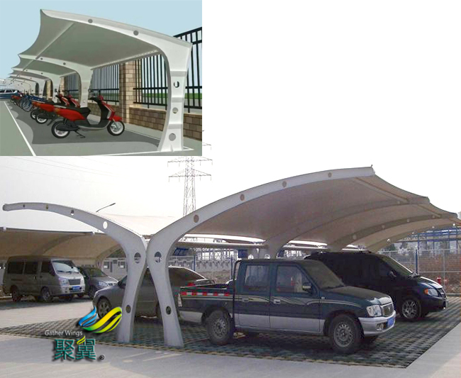 膜結構車棚是建在建筑空地,起到遮陽避雨的作用,或設在建筑物出入口膜結構或頂部陽臺上方用來或,或者避免高空有墜落物砸落下來,起到維護作用的一種建筑。