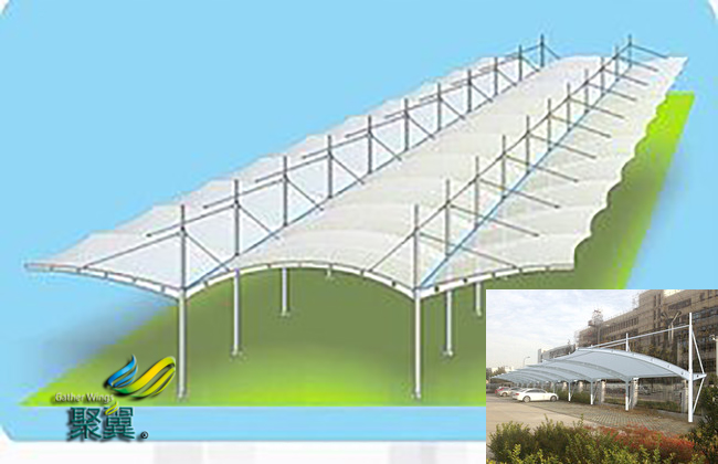 膜結(jié)構(gòu)車棚選用進(jìn)口PVDF膜材料配鋼結(jié)構(gòu)骨架,表面處理采用進(jìn)口船用底漆。