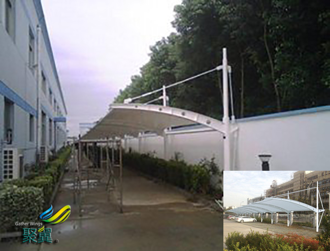 膜結構車棚是在超細玻璃纖維織物上涂以聚四氟乙烯樹脂而成的材料。這種膜材有較好的焊接性能,有優良的抗紫外線、抗老化性能和阻燃性能。