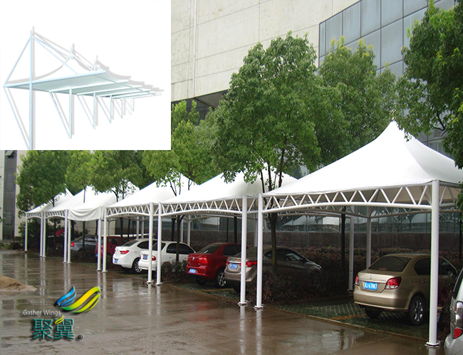 膜結構車棚膜材及其支承構件(鋼結構)組成的建筑物或構筑物,膜結構車棚膜材,由高強度纖維織成的基材和聚合物涂層構成的復合材料。