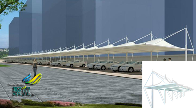 索膜結構車棚是用高強度柔性薄膜材料經受其它材料的拉壓作用而形成的穩定曲面,能承受一定外荷載的空間結構形式。