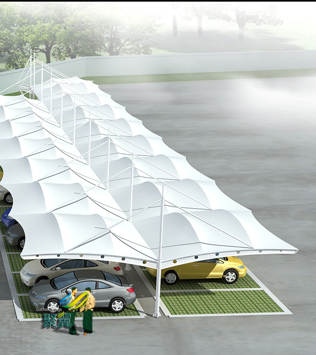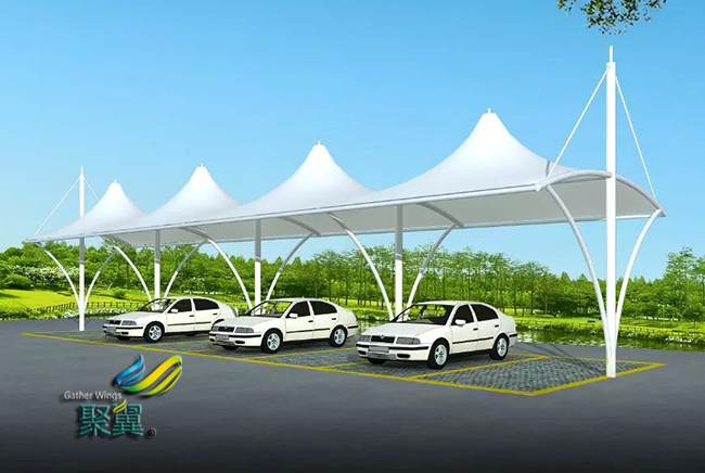 膜結構車棚公司膜結構的施工周期短,膜材裁剪便利。拼合成型及骨架的鋼結構、膜結構車棚鋼索均在工廠加工制造,現場只需拼裝,施工簡潔,所以膜結構車棚施工周期比傳統修建短。