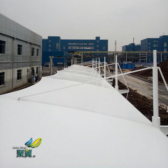 膜結(jié)構(gòu)車棚是在超細(xì)玻璃纖維織物上涂以聚四氟乙烯樹(shù)脂而成的材料。膜結(jié)構(gòu)車棚膜材有較好的焊接性能,有優(yōu)良的抗紫外線、抗老化性能和阻燃性能。