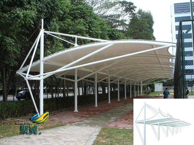 膜結(jié)構(gòu)車棚藝術(shù)性:除了一般雨蓬不可比擬的實(shí)用、耐用、遮風(fēng)擋雨的功能外,膜結(jié)構(gòu)車棚雨蓬更是一座雕塑,一件藝術(shù)品,膜結(jié)構(gòu)車棚給人美的視覺享受。