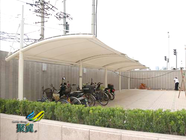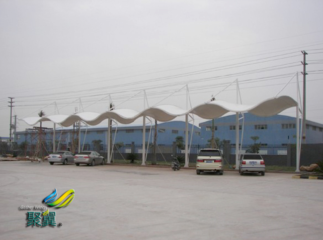 膜結構車棚色感好;人們在棚內對于白色或米白色的膜結構車棚膜材有特別強的顏色感知,這兩種顏色表現出對于可見光具有線性光譜透射的特征。這兩種光的透射程度會隨著透射光波長的增加而增加,這使得透射的光比入射的光要溫暖。