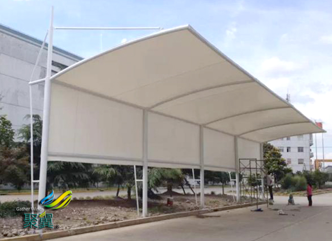 膜結構車棚中的膜材料有一種特別的優勢,因為膜材料有特別的光照優勢,能夠讓在里面停放車輛的人們在沒有燈光下就能夠看清內部一切結構。膜結構車棚材質說明:膜結構車棚在棚內人們對白色或米白色膜結構車棚膜材會有很好的色彩感知,因為這兩種色彩表現出對可見光具備線性光譜透射的特征。