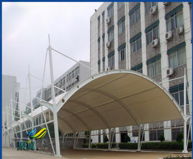 由于膜結構車棚膜材具有清潔膜結構的保護膜,可以使膜結構車棚建筑具有良好的自清潔效果,同時保證了膜結構車棚建筑的使用壽命.