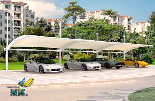膜結構車棚藝術性充分展示了建筑師的想象力,體現了建筑構件的美感.膜結構車棚節約能源,節約能源,節約能源,節約能源. 膜結構車棚防火性能,廣泛使用的膜材料,能很好地滿足防火要求,具有優異的阻燃性和耐高溫性能,達到法國、德國、美國、日本等國家標準.