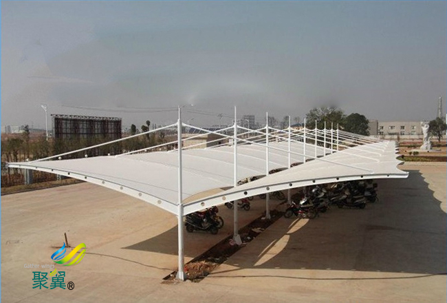 膜結構車棚最值得一提的是它可以根據支撐構件的位置和高低排列組成不同的形狀,這在金屬車棚上是無法想象的。所以膜結構車棚可以通過自身柔美的曲線和周圍的藝術景觀結合起來,給人以美的享受。  作為現代大都市的標志,膜結構車棚立體建筑和立體交通都有了顯著發展,道路擁擠、車滿為患已成為當今快節奏社會中的最不和諧之音,發展膜結構車棚鋼結構停車棚已成為人們的共識。