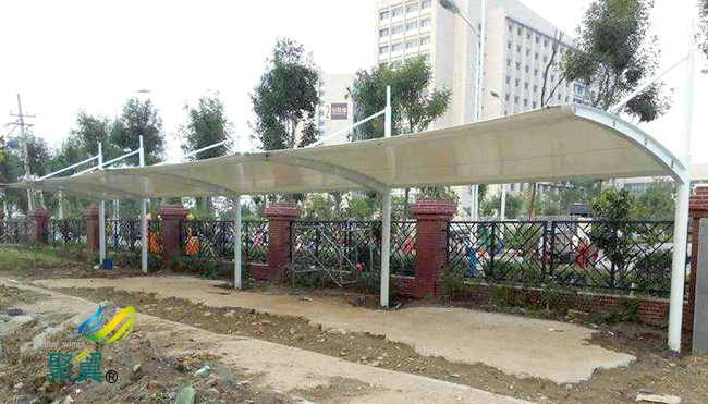 膜結(jié)構(gòu)車棚選用進(jìn)口PVDF膜材料配鋼結(jié)構(gòu)骨架,表面處理采用進(jìn)口船用底漆,炳烯酸聚氨酯面漆藝術(shù)性:除了一般膜結(jié)構(gòu)車棚遮陽棚不可比擬的實(shí)用、耐用、遮風(fēng)擋雨的功能外,膜結(jié)構(gòu)車棚更是一座雕塑,一件藝術(shù)品,給人美的視覺享受。