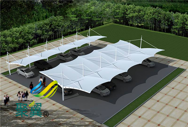 膜結構車棚*值得一提的是膜結構車棚可以根據支撐構件的位置和高低排列組成不同的形狀,這在金屬膜結構車棚上是無法想象的。所以膜結構車棚可以通過自身柔美的曲線和周圍的藝術景觀結合起來,給人以美的享受。