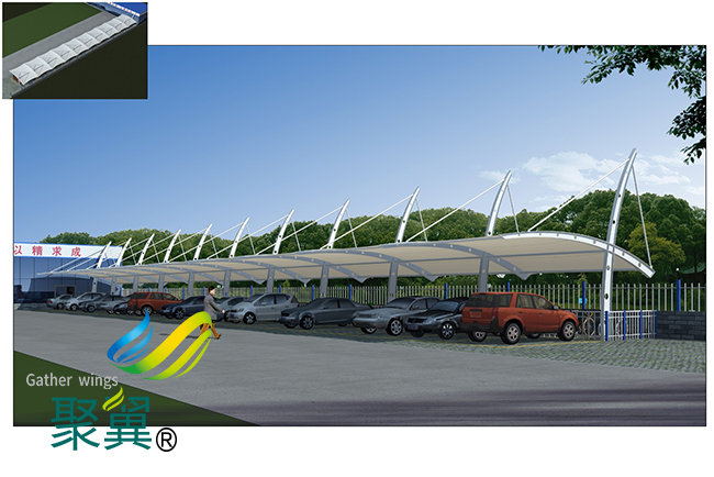 膜結構車棚膜材料是一種完全“柔性”的材料,又是一種介乎不透明的鋼或混凝土與全透明的玻璃之間的“半透光”的材料。