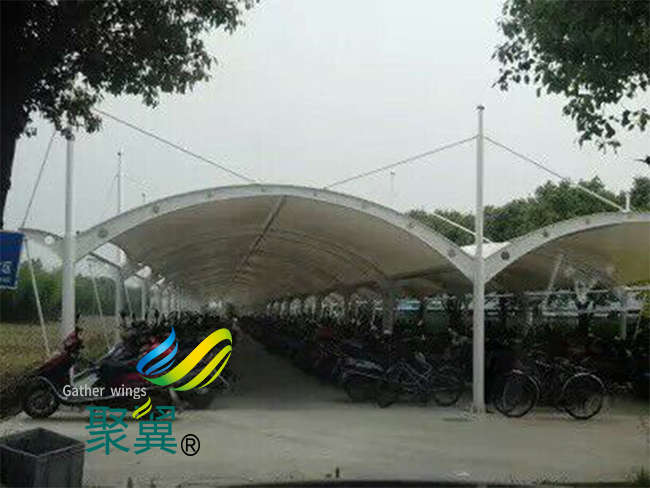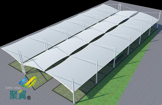 膜結構車棚值得一提的是它可以根據支撐構件的位置和高低排列組成不同的形狀,這在金屬車棚上是無法想象的,所以膜結構車棚可以通過自身柔美的曲線和周圍的藝術景觀結合起來,給人以美的享受。