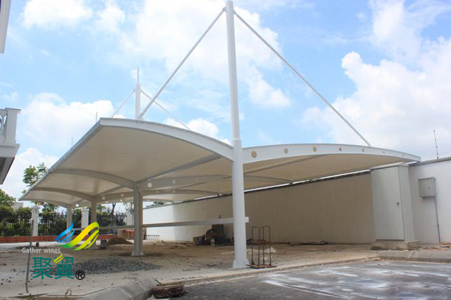 膜結構車棚的安裝應考慮到天氣狀況,如大風等惡劣天氣,再多雨就會停止施工,再過惡劣天氣。