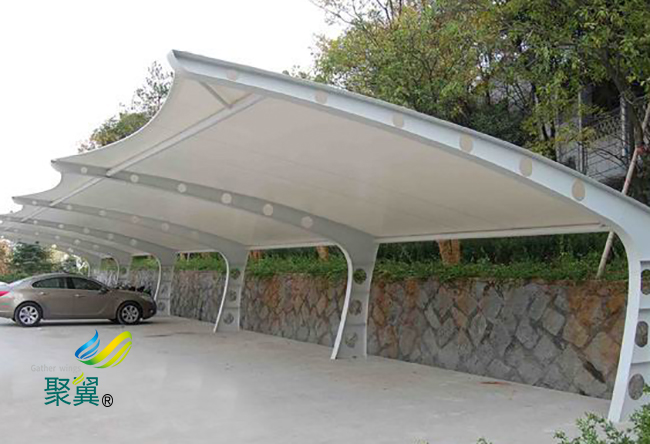 膜結構車棚是用強度柔性薄膜材料與支撐系統相結合形成具有剛度的安穩曲面,膜結構車棚可以承受外荷載的空間結構方式。膜結構車棚具有造型自在輕盈、阻燃、制作簡易、安裝快捷、節能、易于運用等長處。