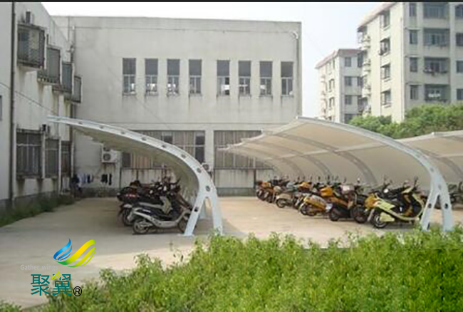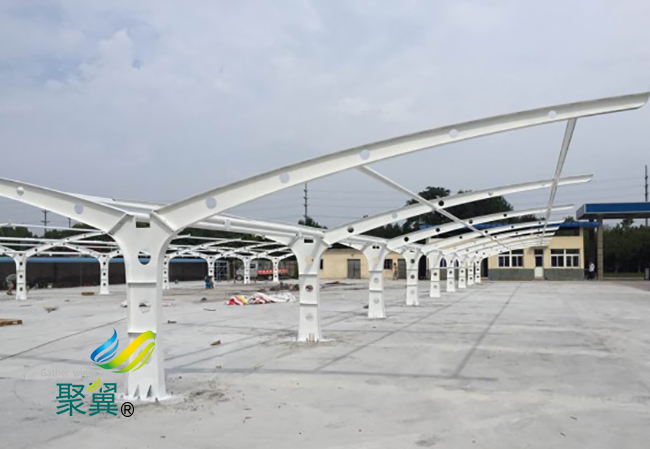 膜結構車棚PVC膜材一般采用表面涂層的處理方法把容易揮發的添加劑密封在膜結構車棚膜材體內,以此保持膜結構車棚PVC的柔韌性,增強壽命。